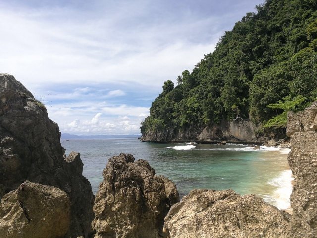Hamparan pasir panjang, laut biru Pasifik, dan latar perbukitan hijau menciptakan panorama alami yang menenangkan.