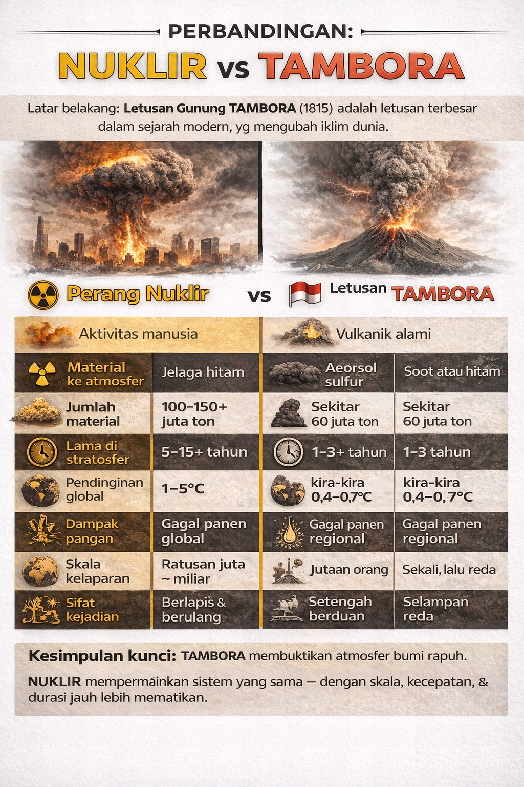 Para ilmuwan memperingatkan bahwa perang nuklir besar dapat memicu fenomena yang disebut nuclear winter. Mekanismenya mirip dengan Tambora, tetapi dengan skala dan durasi yang jauh lebih ekstrem.