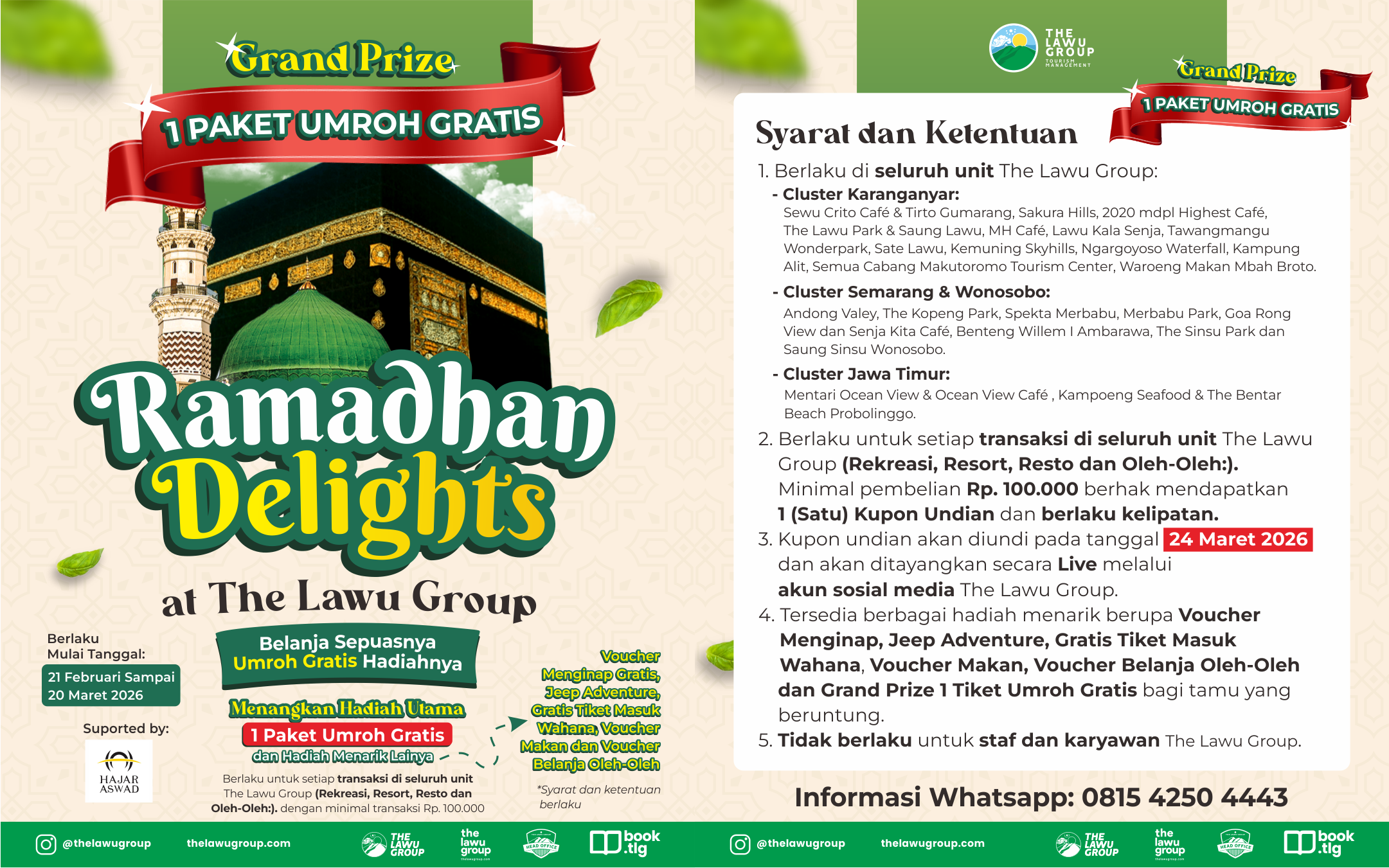 Ramadhan adalah bulan penuh keberkahan. Melalui Ramadhan Delights 2026, The Lawu Group mengajak masyarakat untuk menikmati pengalaman terbaik di berbagai destinasi unggulannya, sekaligus membuka peluang meraih hadiah umroh gratis.
